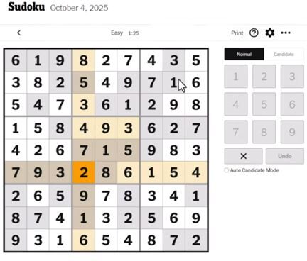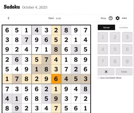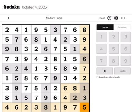 Normal and Candidate are the two NYT Sudoku modes. You can simply fill up the numbers that you are sure about in Normal mode. Whereas in Candidate mode, you can add and remove the probable options of the number that you feel will be the correct entry for an empty cell.