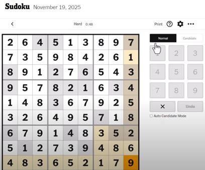 Normal and Candidate are the two NYT Sudoku modes. You can simply fill up the numbers that you are sure about in Normal mode. Whereas in Candidate mode, you can add and remove the probable options of the number that you feel will be the correct entry for an empty cell.